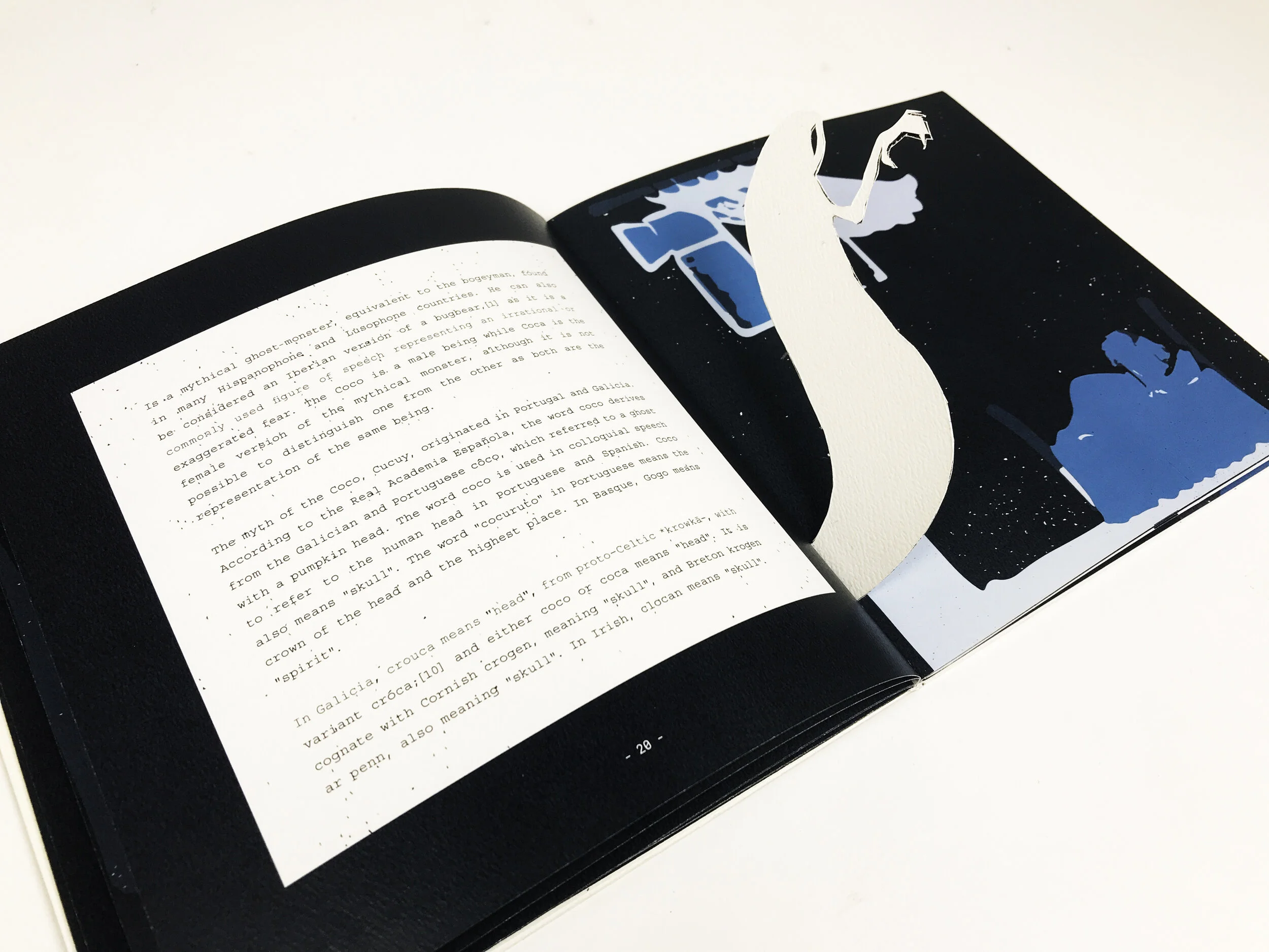 To interact with the book, one needs a flashlight ( a phone’s light preferred) to shine the light against the cut-out figure and the shadow will interact with the background illustration.