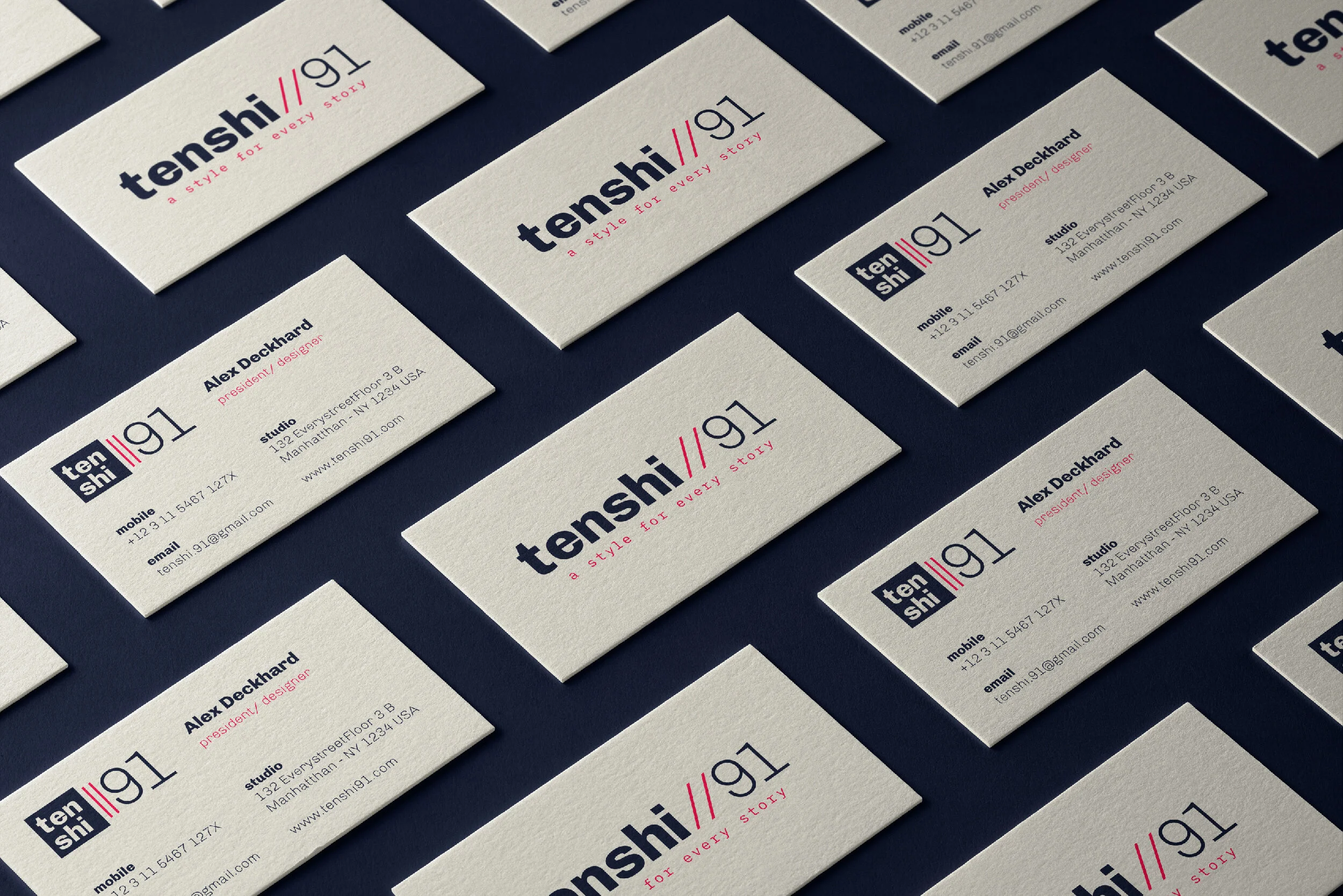 The direction for the design was to create a simple san-serif logo-type with two contrast colors of red and blue hues. The name “Tenshi” is the Japanese word for angel and the number 91 is for the year 1991 in which the founder was born.