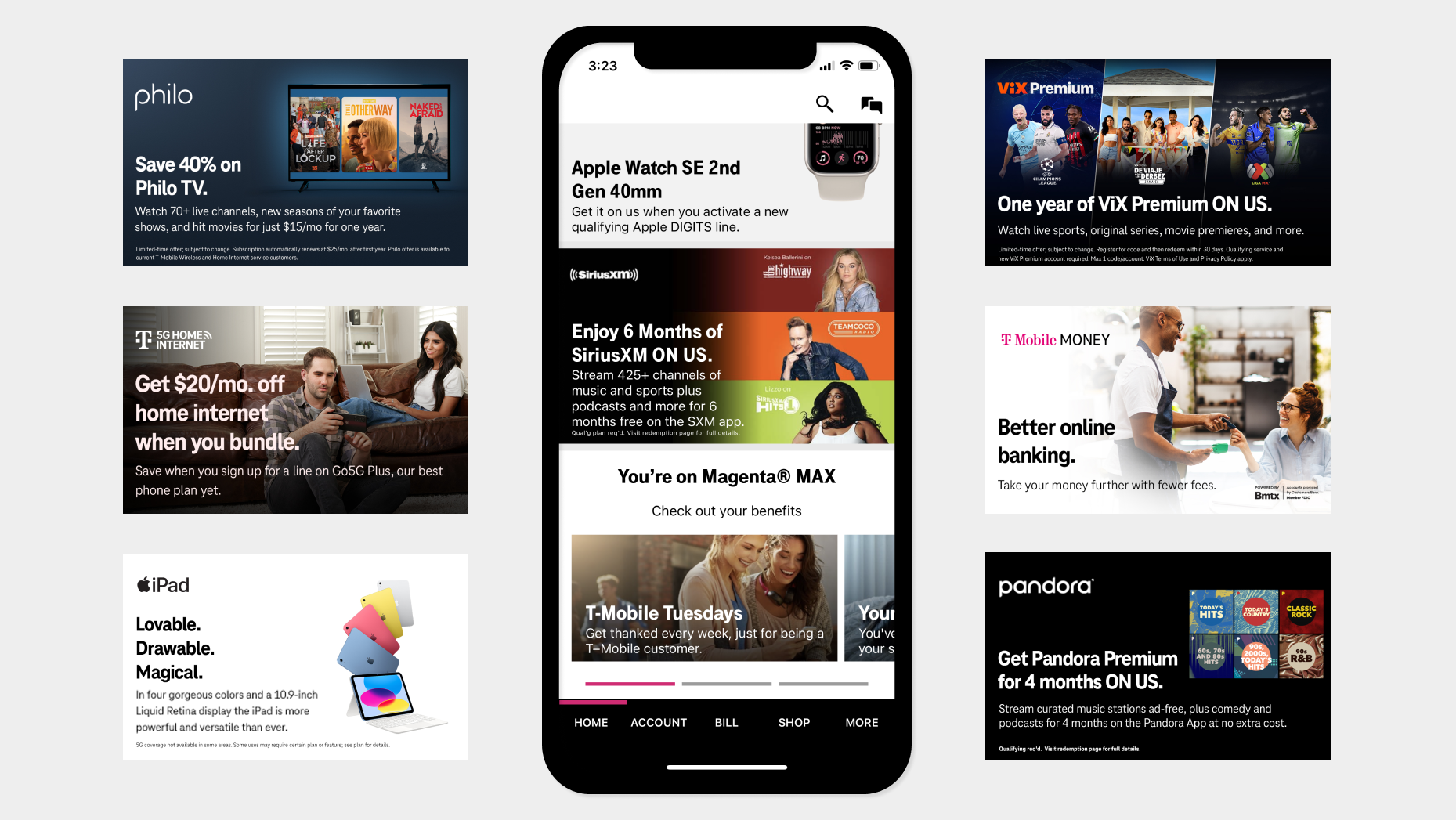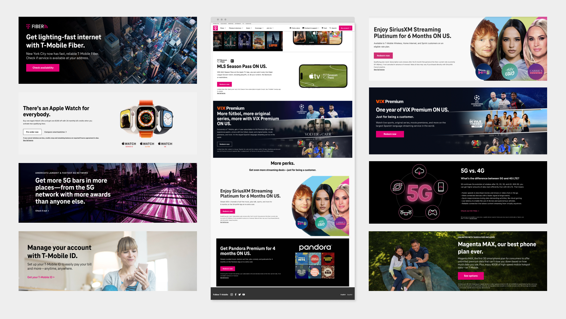 In 2021, I was part of a team to help concept the Hispanic Heritage page and showcase the partnerships that are aligned with T-Mobile and its programs. The following year, the page would go for a second revision and updated information which I asked to be part of as being on the previous team. Along with a copywriter and creative leads, we transitioned the design of basic stacked placements to custom code, stayed on brand, and included a mosaic pattern using the color pallet of T-Mobile’s Multicultural T-digit.
